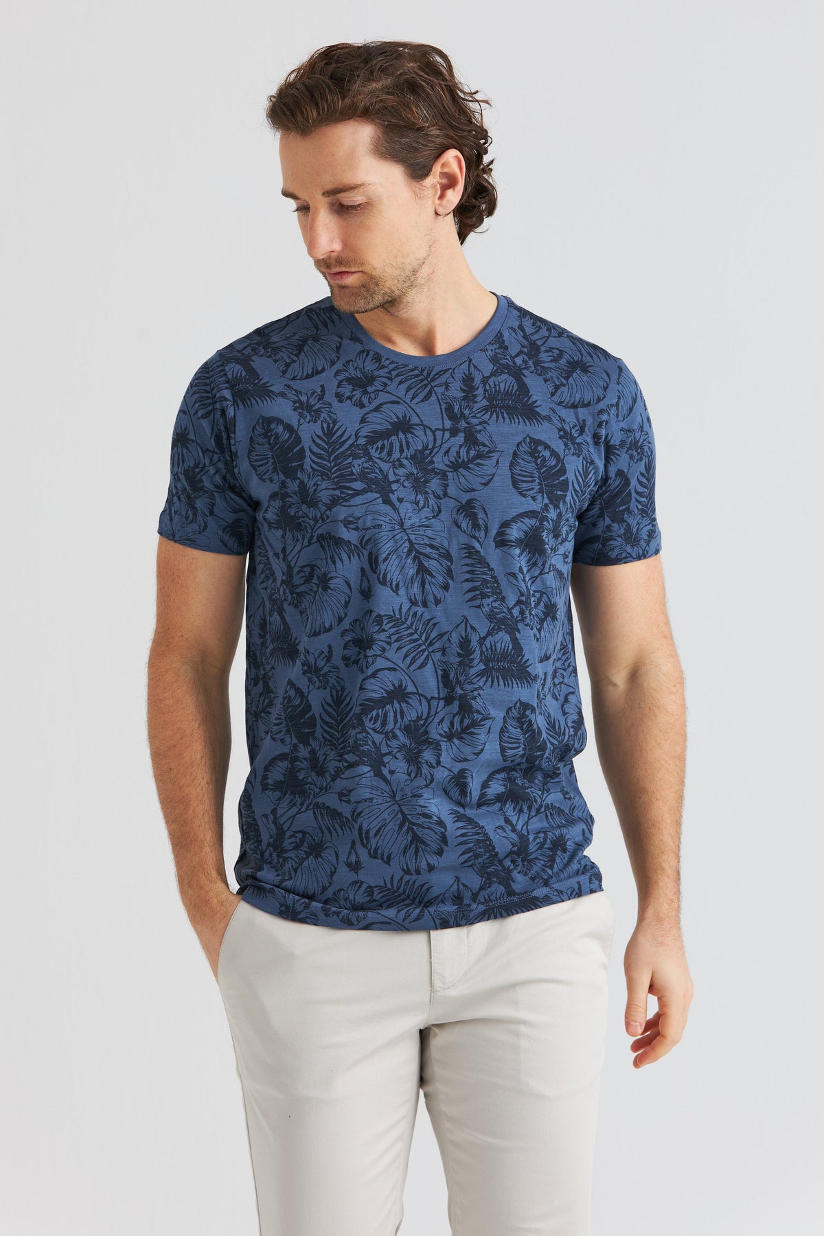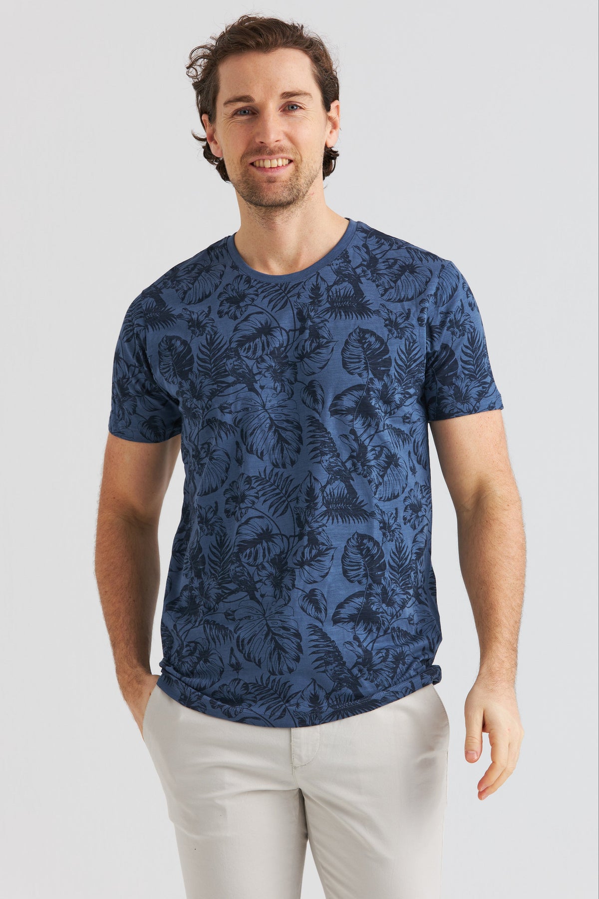 Blå t-shirt med rund hals och ett subtilt palmbladsprint – tillverkad i mjuk 100% bomull. En avslappnad modell med sommarkänsla, perfekt både till vardags och lite ledigare tillfällen.
