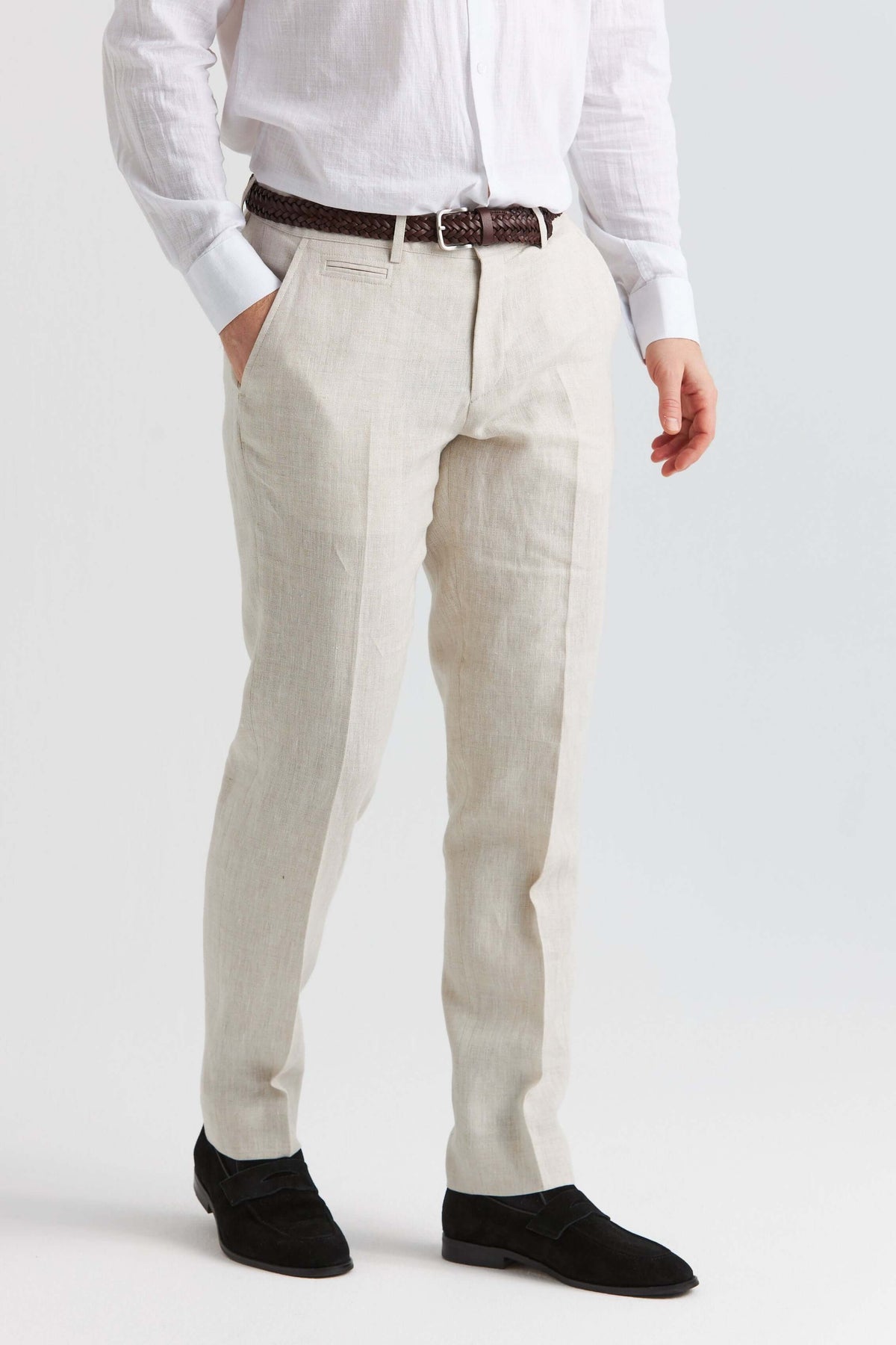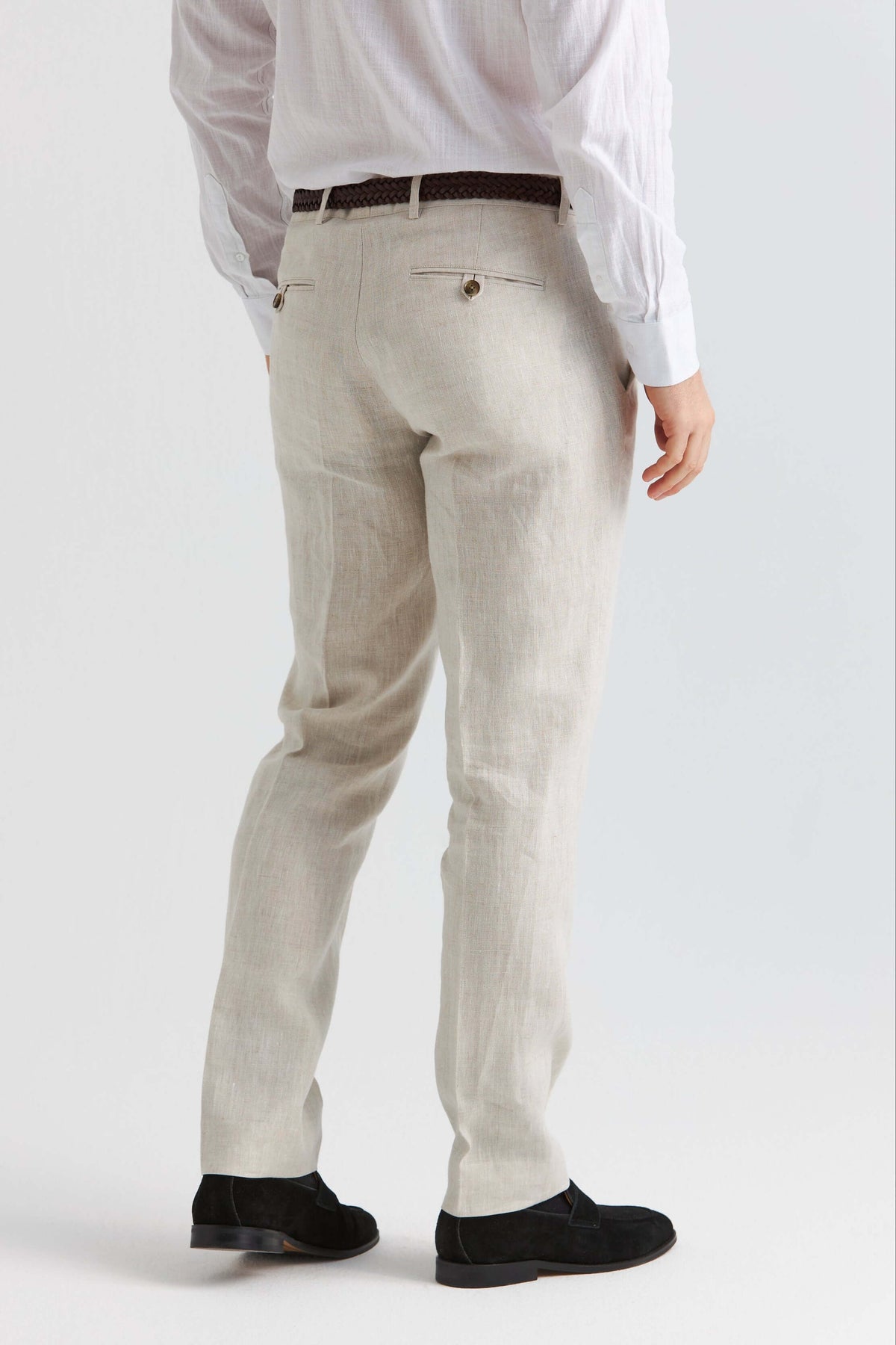 En stilren linnebyxa i en ljus sandton – perfekt för vårens och sommarens varmare dagar. Tillverkad i 100% linne för en sval och luftig känsla, samtidigt som den ger ett avslappnat men välklätt uttryck. Bär den tillsammans med matchande kavaj för en komplett linnekostym, eller kombinera med skjorta eller t-shirt för en mer casual look.