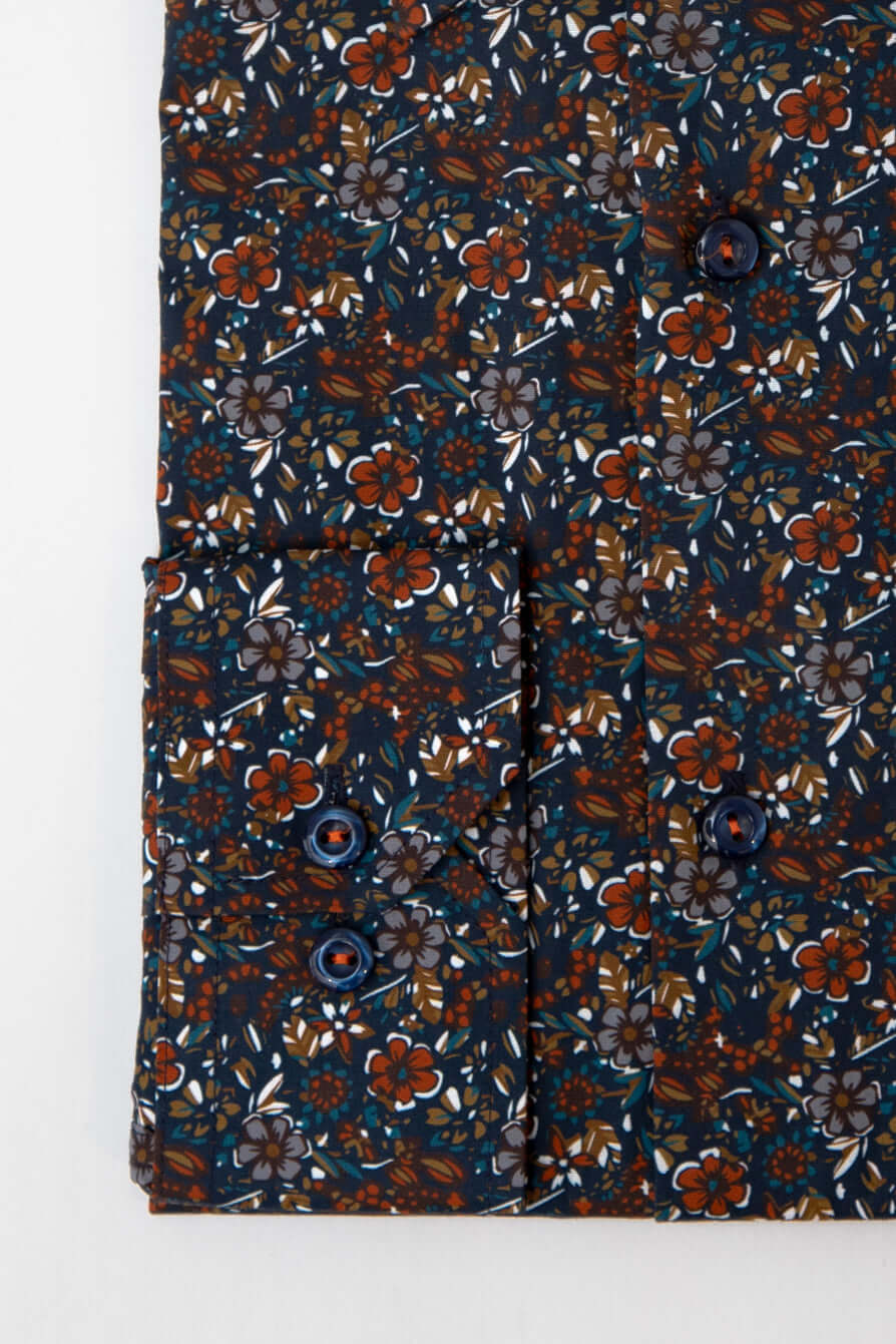 En stilren skjorta i marinblått med ett subtilt blommönster i rött och vitt som ger en modern och elegant känsla. Tillverkad i 100% bomull för en mjuk och behaglig komfort. Skjortan har en regular fit-passform och fungerar lika bra till vardags som till mer uppklädda tillfällen. Ett perfekt val för dig som vill addera lite mönster och personlighet till garderoben.